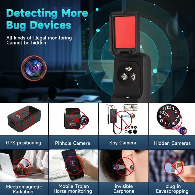 • Obsežno zaznavanje: Učinkovito identificira skrite kamere, GPS sledilnike in naprave za poslušanje zvoka, kar zagotavlja zaščito vaše zasebnosti v vsakem okolju.