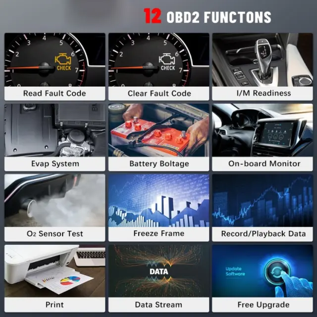 1. Retrieve and erase error codes, live data stream on text or graph format, I/M readiness test, display On-board monitor test results, real time battery voltage, view freeze frame data, Built-in code library, O2 sensor test, Evap system test, record and playback, LED notifications, print data retrieve vehicle information (VIN, CIN, and CVN).