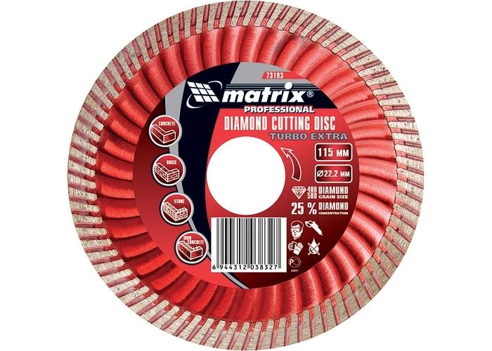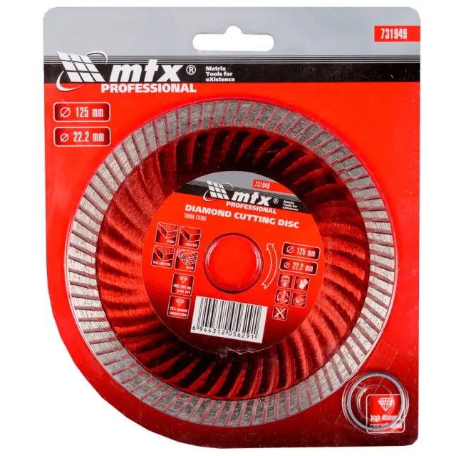 Diamantna rezalna plošča Turbo Extra je nadomestni element za kotne brusilnike. Zasnovan za rezanje betona, armiranega betona in marmorja. Valovita oblika kovinskega podstavka prispeva k najhitrejšemu odstranjevanju produktov žaganja, izboljšanemu hlajenju in zmanjšani obremenitvi kotnega brusilnika. Ploščo odlikuje povečana koncentracija diamantov, izboljšana kvaliteta diamantnih zrn in optimalno izbrana kovinska vez.