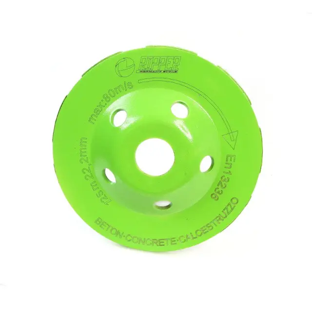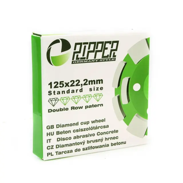 Diamantna segmentna plošča za brušenje betona 125×22,2 mm je visokokakovostno orodje, zasnovano za profesionalno in domačo uporabo pri zahtevnih projektih brušenja trdih materialov. Z izjemno natančnostjo in močjo omogoča učinkovito odstranjevanje betona, malte, estriha, teraca in drugih mineralnih materialov. Plošča je opremljena s kakovostnimi diamantnimi segmenti, ki zagotavljajo hitro in enakomerno brušenje, hkrati pa podaljšujejo življenjsko dobo plošče. Zunanji premer 125 mm in notranji premer 22,2 mm omogočata popolno kompatibilnost z večino kotnih brusilnikov, kar omogoča enostavno namestitev brez dodatnih prilagoditev. Segmentirana zasnova omogoča optimalno hlajenje med delovanjem, kar preprečuje pregrevanje in omogoča daljšo in varnejšo uporabo tudi pri dolgotrajnih projektih. Plošča je idealna za pripravo betonskih površin pred nadaljnjo obdelavo, kot je polaganje tlakovcev, glajenje površin ali odstranjevanje starih premazov. Ta diamantna plošča je popolna izbira za mojstre, gradbenike in domače uporabnike, ki iščejo zmogljivo in vzdržljivo orodje, ki zagotavlja natančne rezultate pri vsakem projektu brušenja betonskih površin. Z inovativno zasnovo in vzdržljivimi materiali vam ta izdelek omogoča hitro, varno in učinkovito opravljanje zahtevnih brušenj. Premer: 125 mm, notranji premer: 22,2 mm Primerno za različne vrste kotnih brusilnikov Kakovostni diamantni segmenti za dolgotrajno uporabo Hitro in natančno brušenje betonskih in drugih trdih površin Segmentirana oblika za boljše hlajenje in zaščito pred pregrevanjem Idealen za profesionalno in domačo uporabo Z našo diamantno segmentno ploščo za brušenje betona boste z lahkoto dosegli gladke in pripravljene površine za nadaljnjo obdelavo. Investirajte v visoko zmogljivost in natančnost! Posebna diamantna brusna plošča z zelo velikim diamantom se uporablja za čiščenje in brušenje nepravilnosti na površinah betona, vidnega betona, opeke, tlakovcev, klinkerja, porobetona in keramičnih ploščic. • Diamantna skodelica  premera 125 mm  je namenjena za brušenje betonskih površin s kotnim brusilnikom. • Dolgo življenjsko dobo diamantne čašaste plošče zagotavljajo odlični tehnični parametri. • Sodobni postopki toplotne obdelave in posebna površinska obdelava zmanjšajo obrabo diska in izboljšajo vzdržljivost. • 5 mm visok diamant  omogoča dolgotrajno uporabo diska brez zamenjave z novim. • Disk je idealen za odstranjevanje neravnin, oblikovanje in brušenje velikih betonskih površin