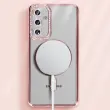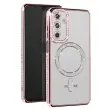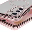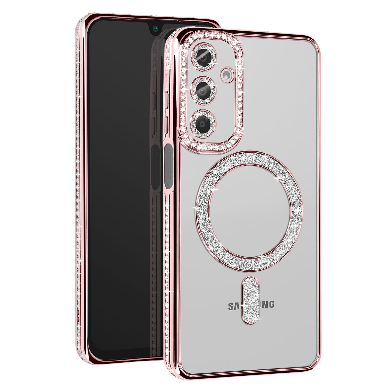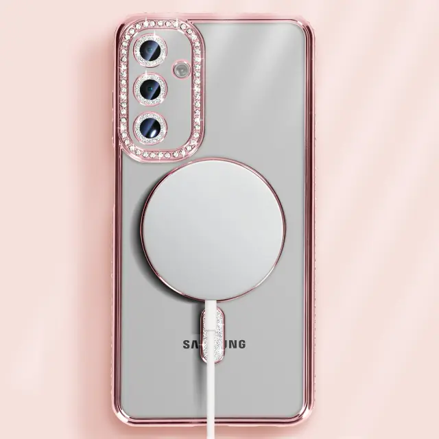 To ohišje ima vgrajen magnetni obroč, ki je združljiv s sistemom MagSafe.. Obris z diamantnim učinkom in elegantnim zaključkom v šampanjsko rožnati barvi. Prozorna zadnja stran, tako da je vidna barva telefona. Trdna zaščita pred praskami in udarci.
