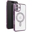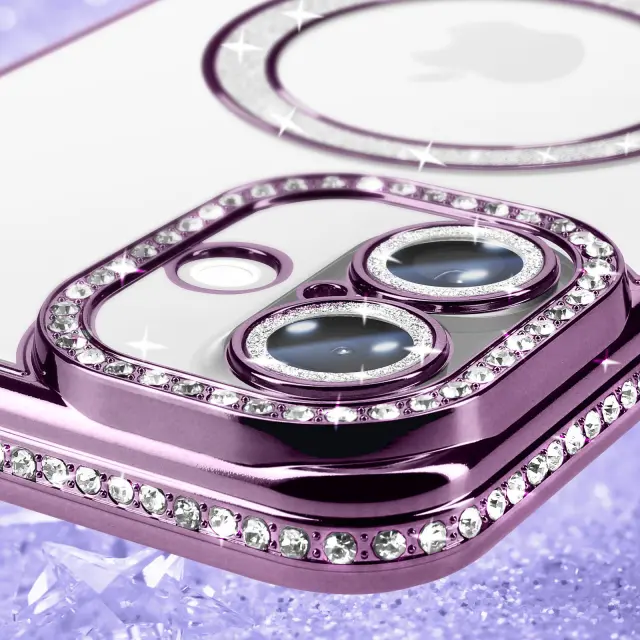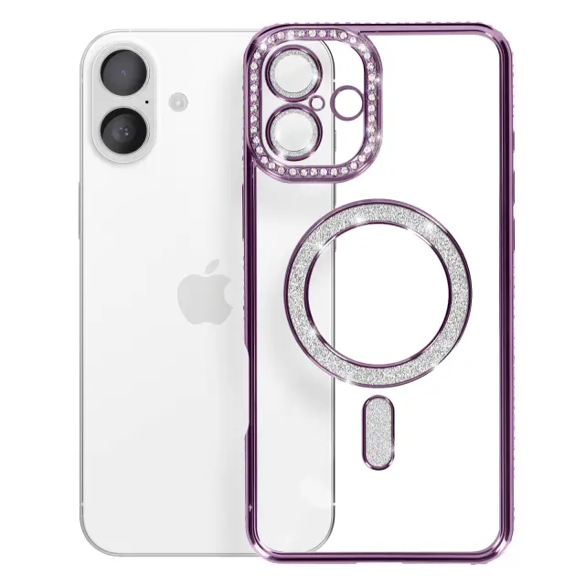 To ohišje je opremljeno z magnetnim obročem za dodatno opremo, ki je združljiv s sistemom MagSafe.. Vijolična obroba z diamantnim učinkom in zaključkom iz ametista s kristalčki. Prozorna zadnja stran, ki ohranja prvotno zasnovo telefona. Trdna lupina iz polikarbonata, odporna proti udarcem.