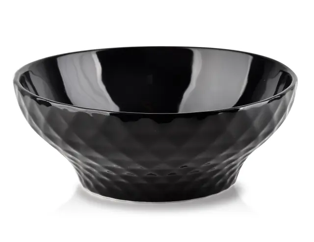 DIAMOND BLACK Posoda 17,5x7cm 700 ml DIAMENT Miska czarna z delikatnym tłoczeniem w romby 17,5x12,5 cm Miska z serii porcelany DIAMNET o średnicy 17,5 cm i wysokości 12,5 cm. Ozdobiona delikatnym tłoczeniem w kształcie rombów, uprzyjemni każdy posiłek. Miskę można swobodnie myć w zmywarce i używać mikrofalówce, co ułatwi codzienne użytkowanie. Porcelana użyta do produkcji miski jest wysokiej jakości, a sama miska zapakowana jest w ozdobne opakowanie, które będzie starannie zabezpieczone na czas transportu. Objętość: 0,7 l