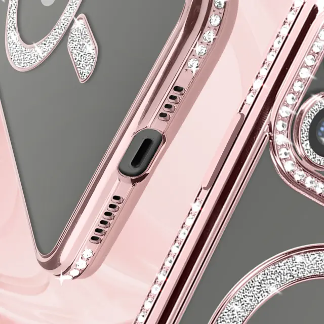 Diamantna obloga s kristali v barvi rožnatega zlata, ki vaši [ime naprave] daje razkošen in eleganten videz. Zaradi prozorne hrbtne strani je originalna barva vašega iPhona popolnoma vidna, kar zagotavlja edinstven videz. Vgrajen magnetni obroč je popolnoma združljiv z dodatki MagSafe: držali za kartice, stojali, polnilniki itd.. Robusten, trpežen material, ki vaš iPhone varuje pred vsakodnevnimi nevarnostmi.