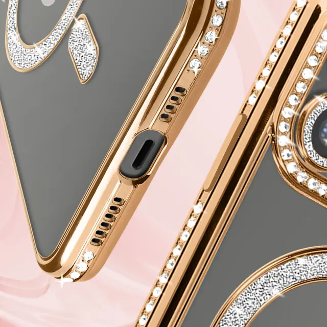 Diamantna školjka s kristali ob zlatem robu daje vaši [ime naprave] razkošen in eleganten videz.. Zaradi prozorne hrbtne strani je originalna barva vašega iPhona popolnoma vidna, kar zagotavlja edinstven videz. Vgrajen magnetni obroč je popolnoma združljiv z dodatki MagSafe: držali za kartice, stojali, polnilniki itd.. Robusten, trpežen material, ki vaš iPhone varuje pred vsakodnevnimi nevarnostmi.