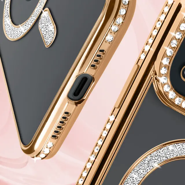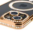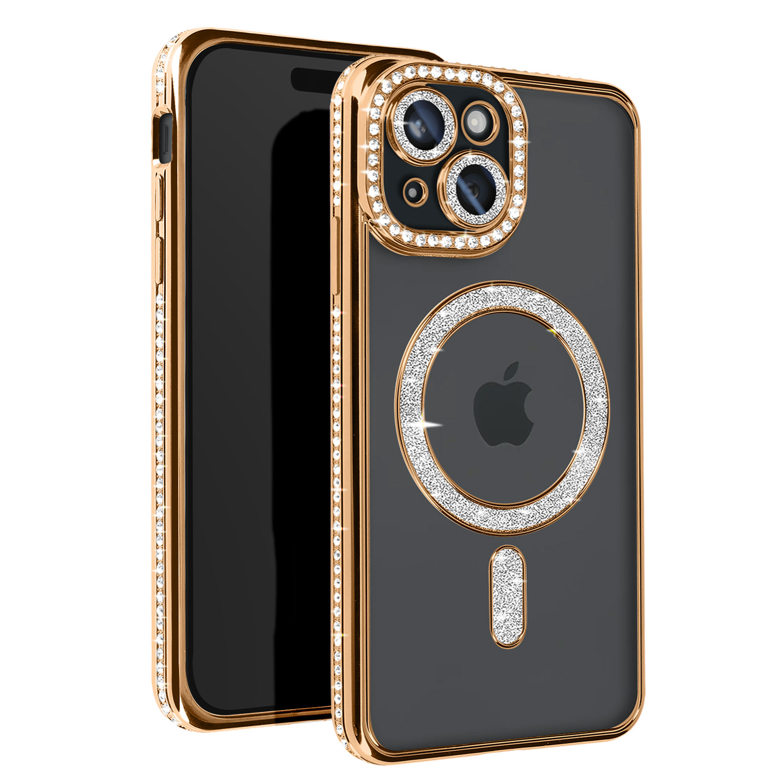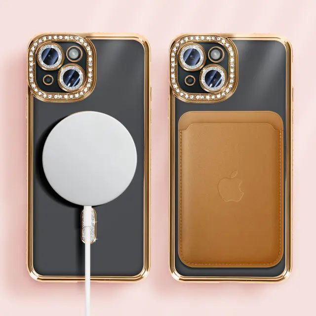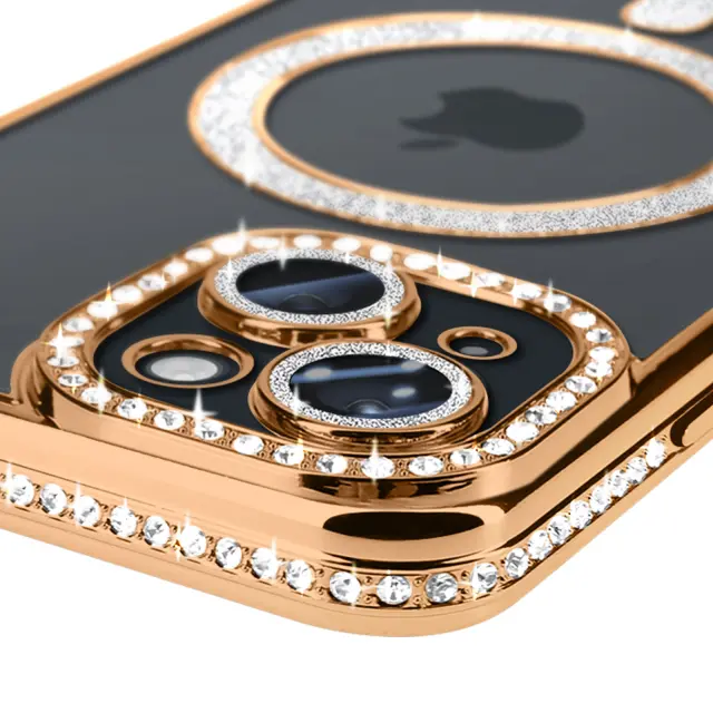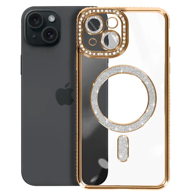 Diamantna školjka s kristali ob zlatem robu daje vaši [ime naprave] razkošen in eleganten videz.. Zaradi prozorne hrbtne strani je originalna barva vašega iPhona popolnoma vidna, kar zagotavlja edinstven videz. Vgrajen magnetni obroč je popolnoma združljiv z dodatki MagSafe: držali za kartice, stojali, polnilniki itd.. Robusten, trpežen material, ki vaš iPhone varuje pred vsakodnevnimi nevarnostmi.
