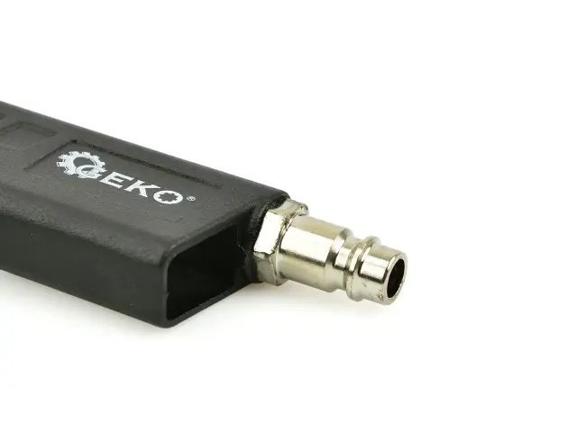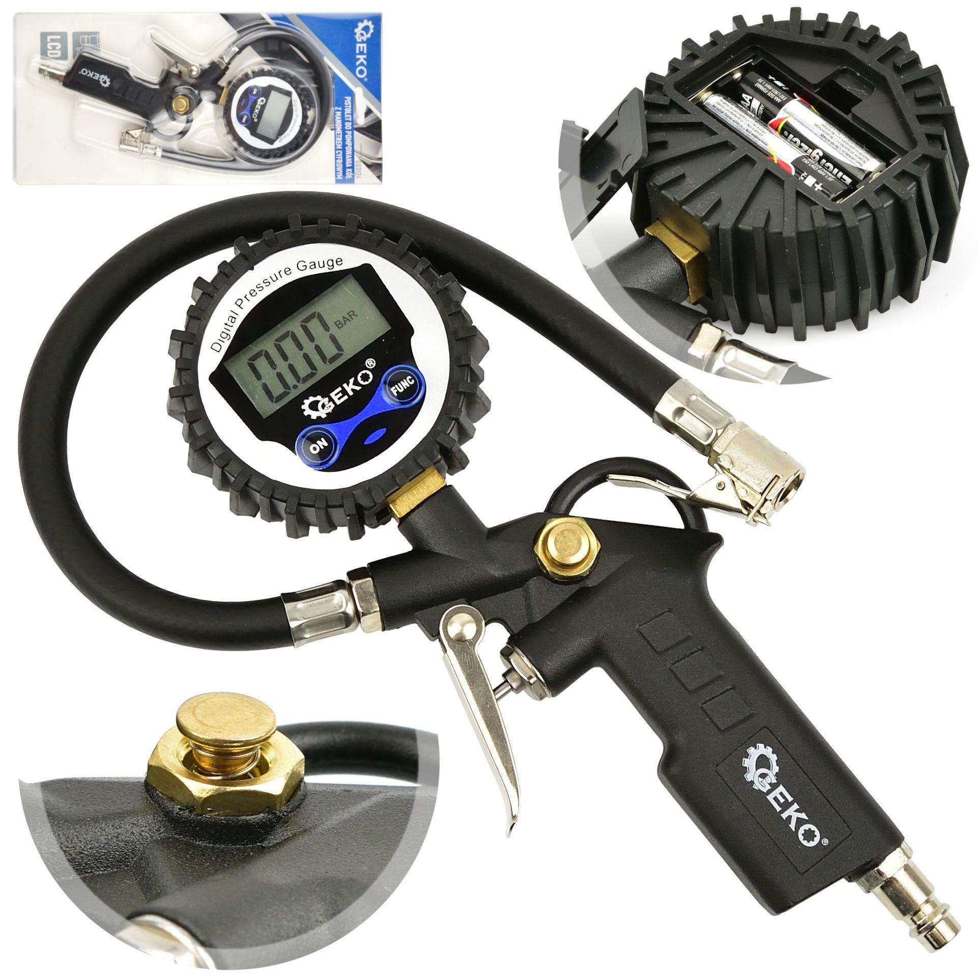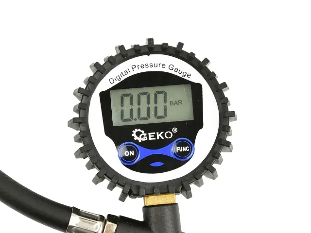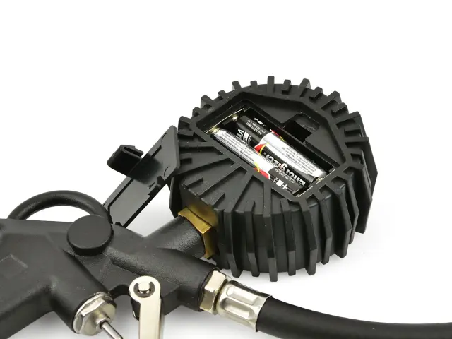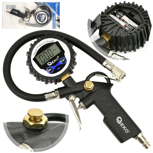 Profesionalna pnevmatska pištola z LCD manometrom – za polnjenje avtomobilskih in tovornih koles. Opremljen z gibljivo cevjo dolžine 30 cm in velikim berljivim manometrom z LCD zaslonom v gumijastem pokrovu, ki ščiti pred udarci . Merilna skala v štirih enotah – Psi, Bar, kPa, Kg/cm2 . Hitra spojka 1/4″ omogoča hitro priključitev na kompresor.