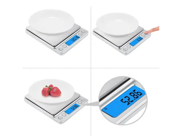 Majhne dimenzije pladnja za tehtanje: 105 x 105 x 5 mm