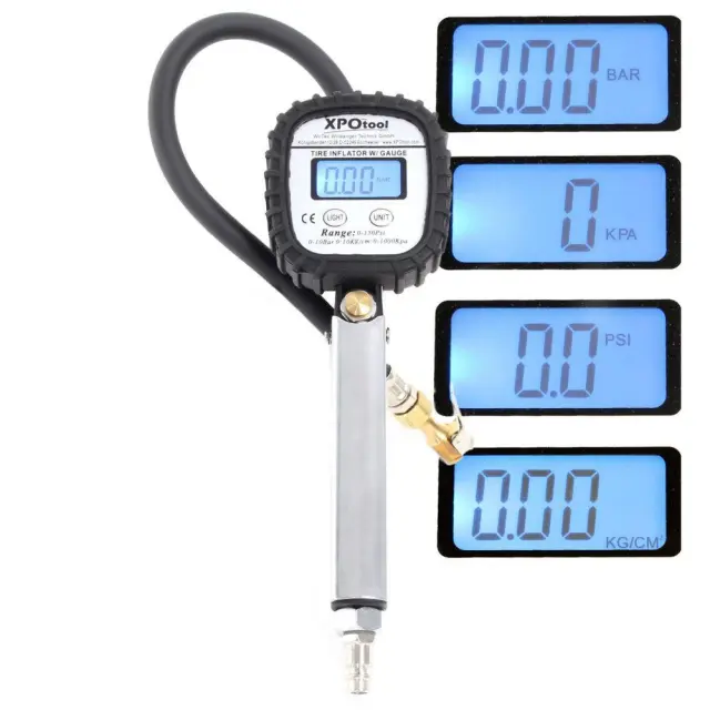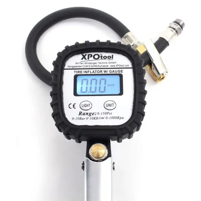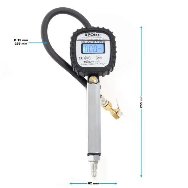 Pištola za polnjenje pnevmatik je zasnovana za merilno območje od 0 do 10 barov. Meritve je mogoče videti na digitalnem zaslonu v enotah bar, psi, kPa in kg/cm². Dve AAA bateriji, vsaka z 1,5 V, potrebni za zaslon, sta vključeni v obseg dobave. S hitrim priključkom ¼″ lahko polnilno pištolo priključite na kateri koli standardni kompresor.