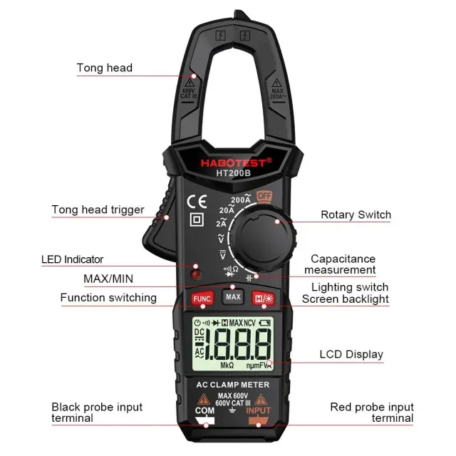Kompaktne klešče HT200B omogočajo natančno merjenje različnih parametrov. Opremljen je z osvetljenim HD zaslonom in čeljustmi, katerih velikost je do 18 mm. Kljub svoji majhnosti navdušuje s funkcionalnostjo. Za napajanje potrebuje 2 AAA 1,5 V bateriji, ki ju je treba kupiti posebej - nista priloženi v kompletu.