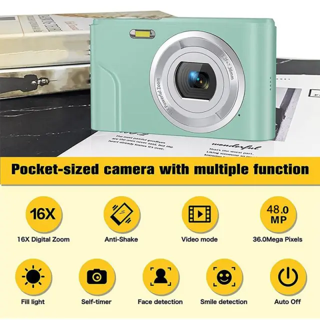 Večfunkcijski digitalni fotoaparat: mini fotoaparat ima vrsto praktičnih funkcij, kot so stabilizacija proti tresljajem, prepoznavanje obraza, zajem nasmeha, neprekinjeno fotografiranje in funkcije časovnika za selfije. Priložena je tudi 32 GB spominska kartica.