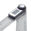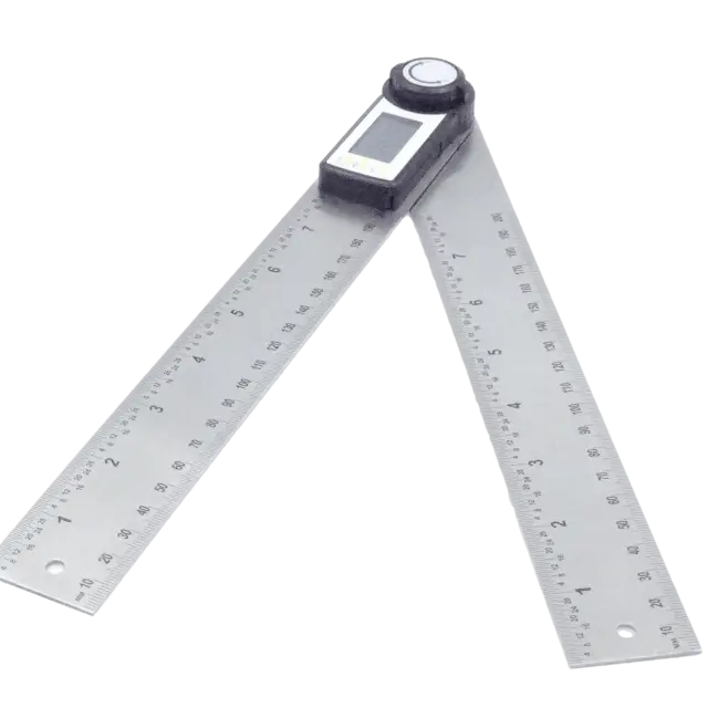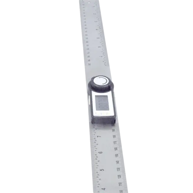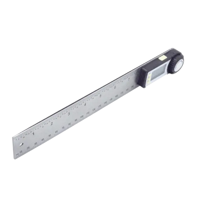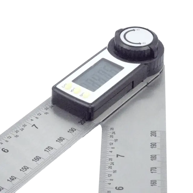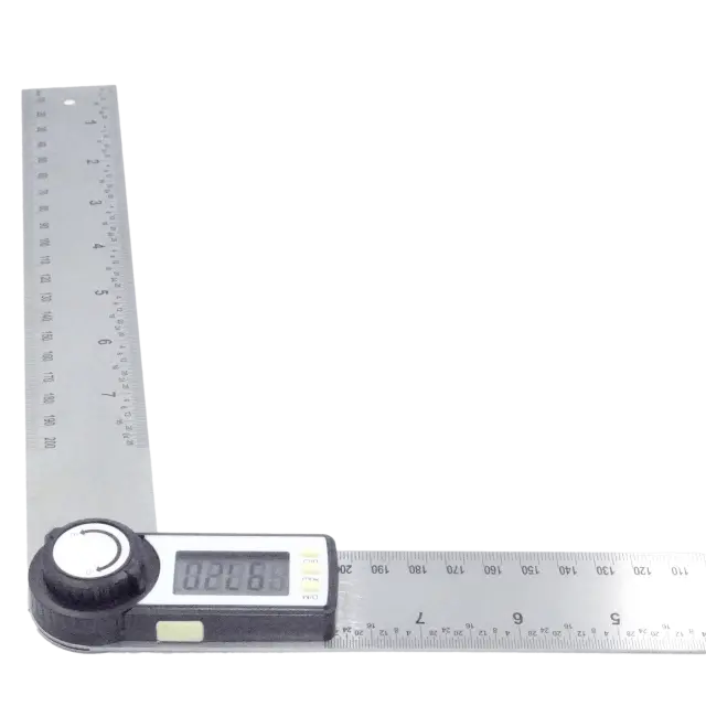 Kotni nosilec iz nerjavečega jekla z digitalnim LCD zaslonom za hitro in natančno branje. Dve 28-centimetrski roki imata vgravirano 200-milimetrsko lestvico v mm in palcih. Črno napisana matura je odlična za kvadrat, zato je zelo čitljiva. Kvadrat je opremljen z močno blokado, ki vam omogoča prenos izmerjenih kotov brez strahu pred njihovim premikom. Na obeh rokah so luknje za obešanje kotnika v delavnici.