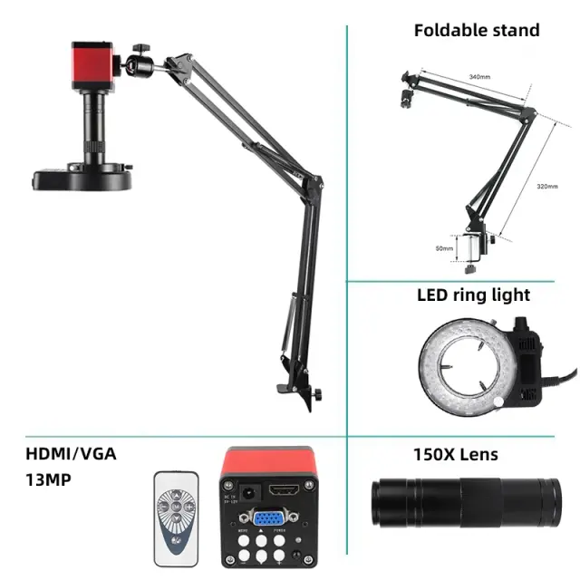 Celovit paket: Mikroskop je popoln s 150X lečo, LED obročasto svetlobo za osvetlitev in zložljivim stojalom, kar ponuja vse, kar potrebujete za učinkovito nastavitev pregleda.