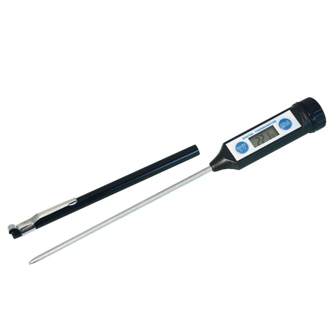 DIGITALNI VBODNI KUHINJSKI TERMOMETER je praktični pomočnik namenjen domači ali profesionalni rabi. Vbodna igla (sonda) s senzorjem meri 12,5 cm in je izdelana iz nerjavečega jekla 18/10. Ohišje in priročen pokrovček s sponko pa iz plastične mase (PVC). LCD zaslon beleži temperaturo od -50 °C do +200 °C.