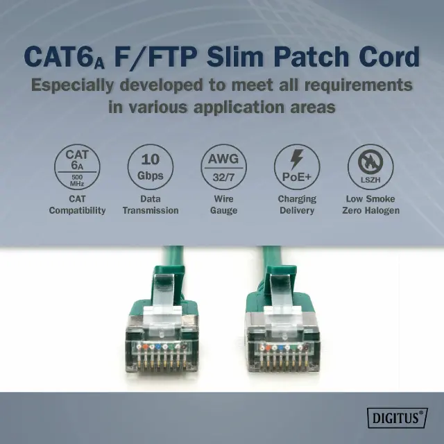 Digitus mrežni F/FTP kabel CAT.6A je zaradi majhnega zunanjega premera 3,8 mm optimalen za uporabo v komunikacijskih omarah. Fleksibilna zasnova omogoča učinkovitejšo organizacijo kablov ter zmanjšuje porabo prostora. Omogoča hitrost prenosa do 10 Gbit/s na frekvenci 500 MHz in je primeren za PoE+ napajanje.