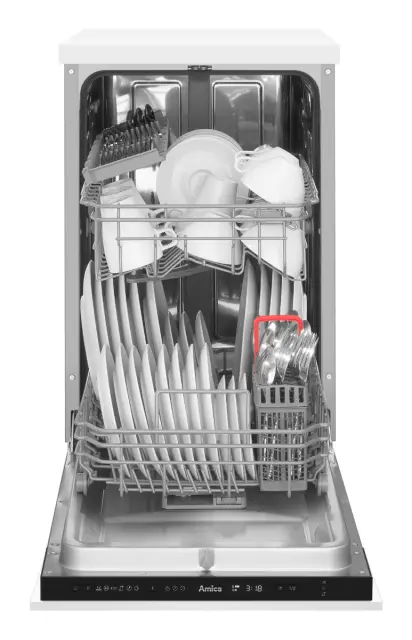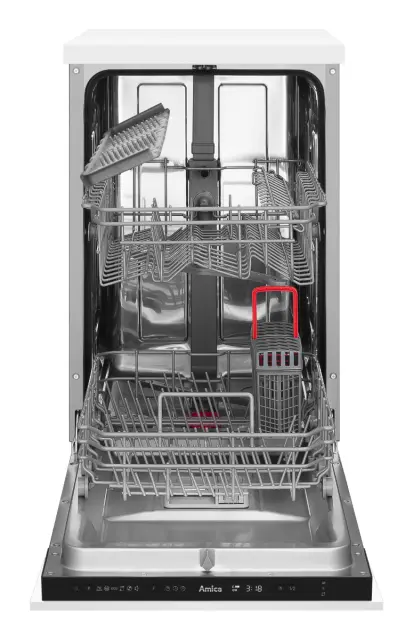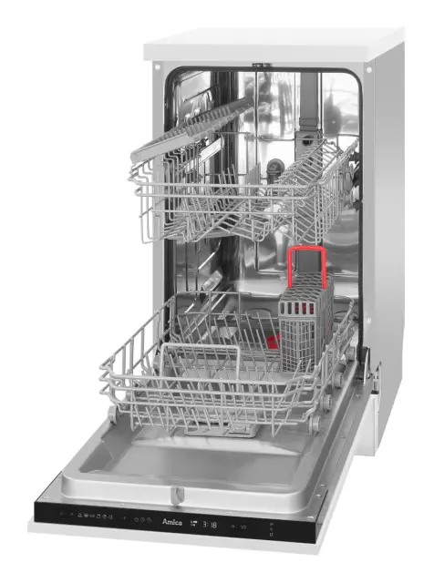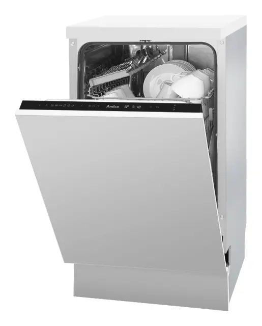 Popolnoma vgradni pomivalni stroj Amica DIM42E6qH širine 45 cm odlikuje učinkovito delovanje in je svojimi 6 programi in kapaciteto 10 pogrinjkov zanesljiv partner vsakega gospodinjstva. Pomivalni stroj navdušuje z možnostjo polovičnega polnjenja, sistemom sušenja Extra drying, elektronskim upravljanjem, indikatorjem soli in sredstva za izpiranja, zakasnitvijo vklopa do 24 ur, LED prikazovalnikom programov, zvočnim signalom ob koncu delovanja, protibakterijskim filtrom in inox kadjo. Udobno pomivanje omogočata 2 košari in košara za pribor, pomivalni stroj pa porabi le 9 litrov vode na cikel pomivanja.