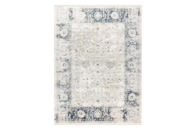 DISTIN 0843A bela / mornarsko modra / modra moderna preproga - Ornament, okvir, vintage, resice 200x290 cm