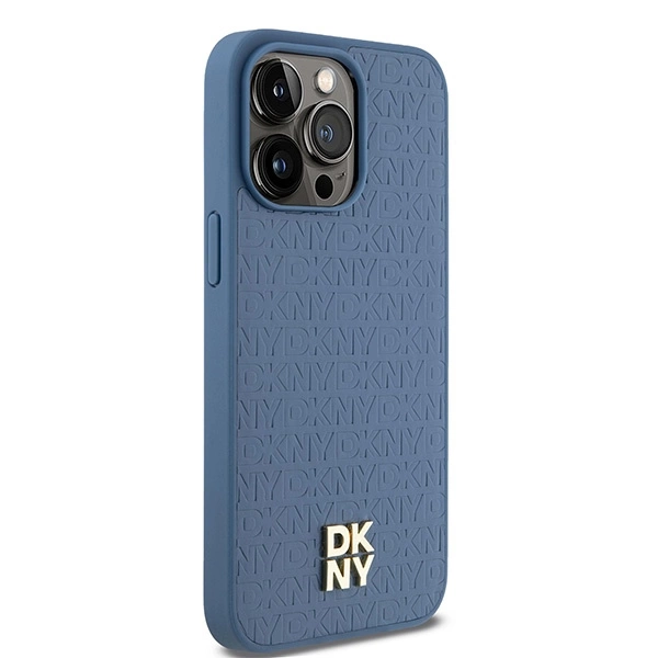 Torbica DKNY Leather Monogram Pattern Metal Logo za MagSafe ima eleganten modri usnjeni material, kovinski logotip DKNY, združljivost z MagSafe in subtilen monogram, ki dodaja razred.