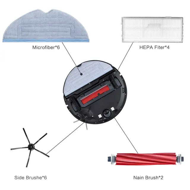 Komplet dodatkov za robotski sesalnik Xiaomi Roborock, ki vsebuje gumijaste krtače, stranske krtače, filter sesalnika, krpe za brisanje, izvijač in čistilno krtačo.