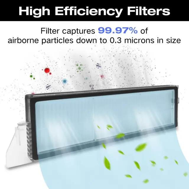 Učinkovito filtriranje in čiščenje: Visokokakovostna gumijasta krtača učinkovito zrahlja umazanijo, medtem ko stranske krtače sežejo v kote in robove, da odstranijo več umazanije, prahu in ostankov. Učinkovit filter sesalnika poskrbi za čisto notranje okolje.