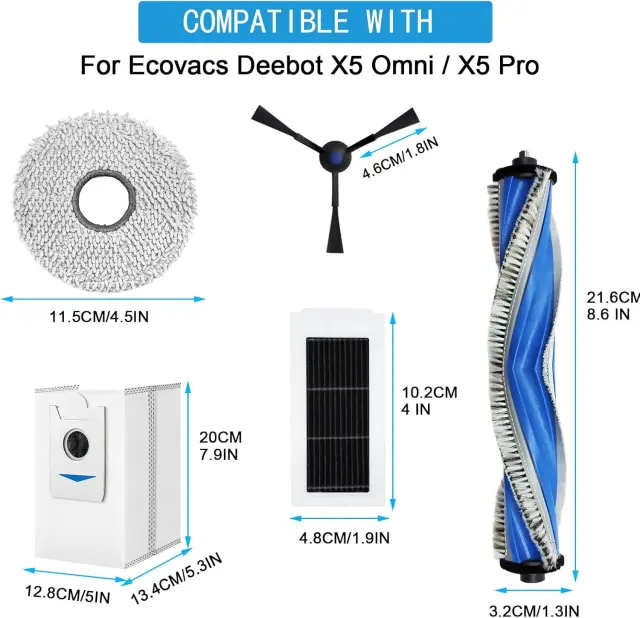 Popolna združljivost: nadomestni deli se natančno prilegajo, da brezhibno dopolnjujejo originalno opremo vašega robotskega sesalnika Ecovacs Deebot X5 Omni / X5 Pro. Vse dele je mogoče preprosto zamenjati brez orodja.