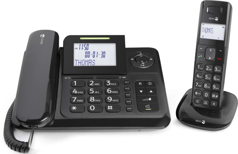 Žično Großtastentelefon z optičnim signalom za klicanje in odgovornikom (do 14 minut kapacitete snemanja) ter dodatnim DECT ročnim telefonom. Kristalno jasna zvočna kakovost s tehnologijo Doro TrueSound, funkcija Boost za glasnejši in jasnejši zvok (24 dB), osvetljen zaslon, 10 zvonjenj, združljivo s slušalkami za sluh.
