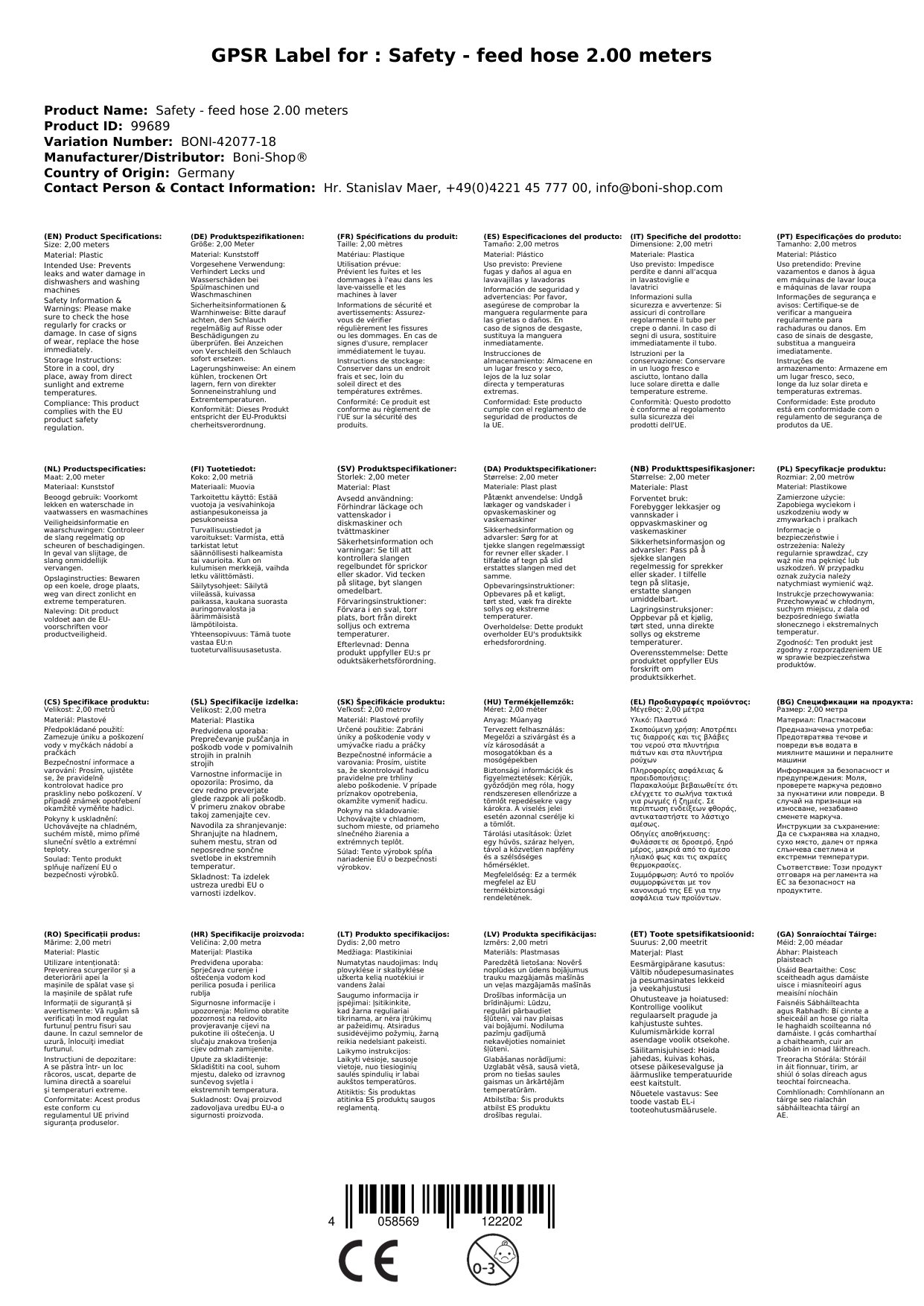 Cev je izdelana iz visokokakovostne plastike, opremljene s trpežnimi gumijastimi tesnili, kar omogoča dolgo življenjsko dobo in delovanje pri temperaturah do 90°C. S priključkom 3/4 cola je ta cev združljiva z vsemi standardnimi gospodinjskimi aparati, kar zagotavlja njeno vsestranskost in enostavno integracijo v obstoječe sisteme vodovoda.