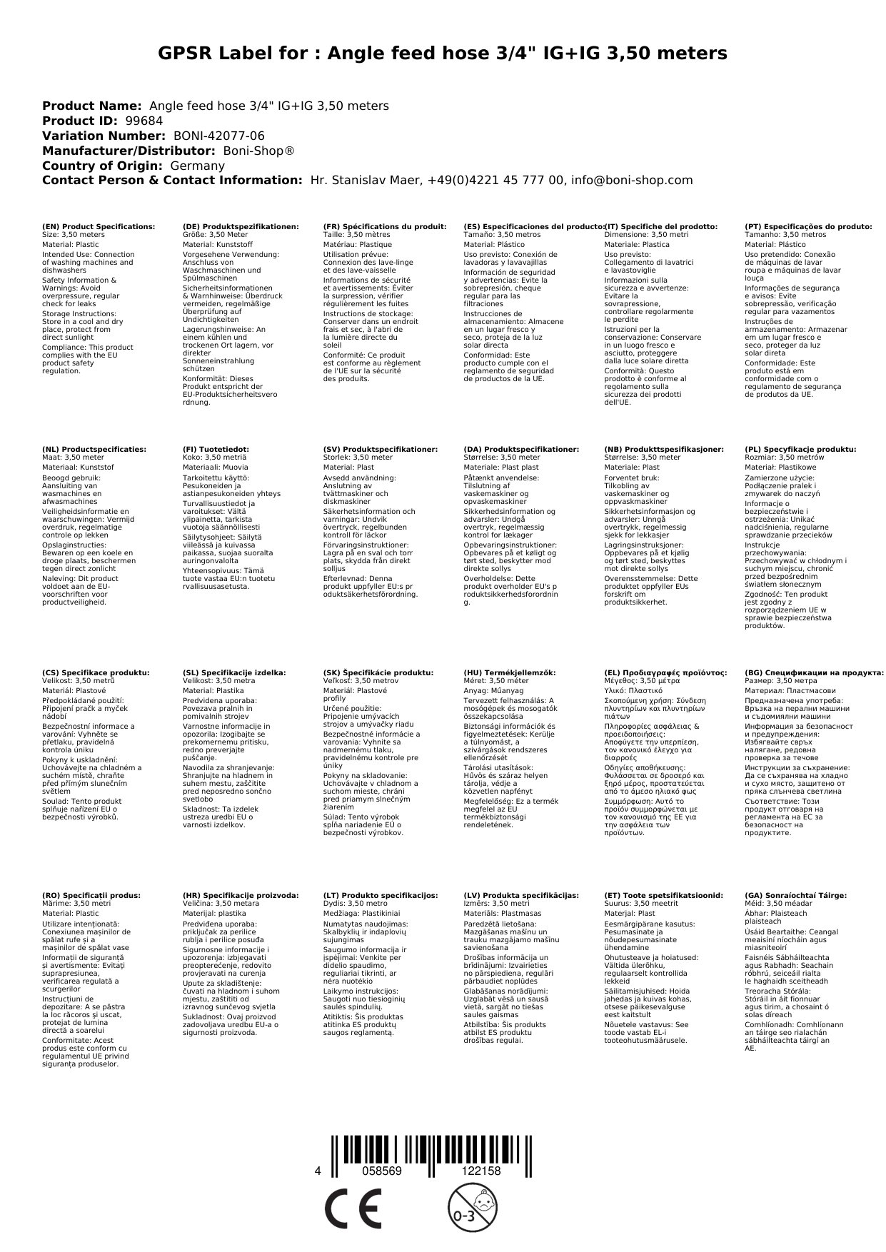 Dovodna cev s kotnim priključkom 3/4, 3,5m EPDM, robustna, enostavna namestitev za pralne in pomivalne stroje