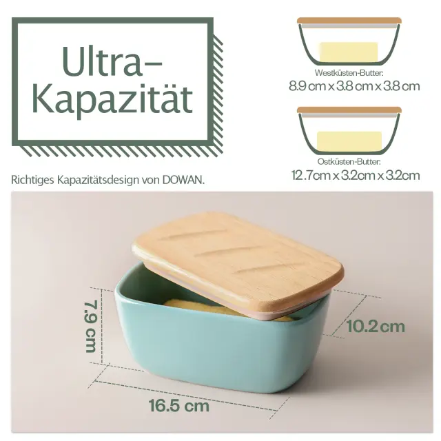 • Velika posoda za maslo - Notranje mere pokrova so približno 16,5 cm x 10,2 cm, kar omogoča shranjevanje masla v vzhodnem slogu (12,7 cm x 3,2 cm) ali zahodnem slogu (8,9 cm x 3,8 cm). Posoda za maslo DOWAN je veliko večja od običajnih pokritih posod za maslo in je primerna za uporabo za vso družino.