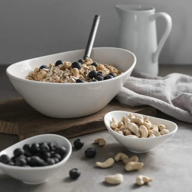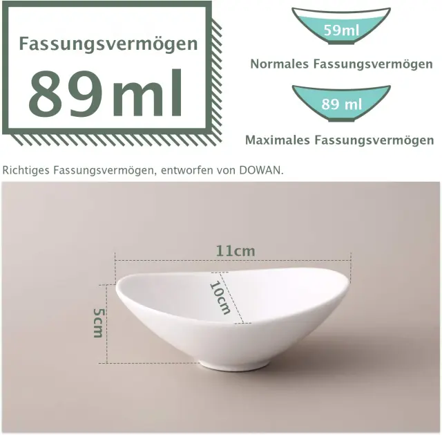 Popolna velikost in prostornina: Te sklede za omako imajo kompaktno velikost, ki sprejme do 89 ml, prostornina sklede za omako pa je priročna za vsakodnevno uporabo. Odlično za posamezne porcije, kot kečap za pomakanje krompirčka, maslo za odcejanje kozic, čatni in olivno olje. In sposobni so postreči majhne jedi, sladice, predjedi in tako naprej. Prikupna oblika: Ta omaka je videti kot ladja, napolnjena z okusno omako. Podaljšani robovi zagotavljajo dobro oporo žlici za serviranje vsebine, ne da bi povzročili nered ali padli žlici. Čiste, elegantne konture in bleščeče bela barva se čudovito podajo k drugemu namiznemu priboru. Zdrav in trpežen porcelan: Sklede za začimbe Dowan so izdelane iz visokokakovostnega porcelana in žgane pri visoki temperaturi, da se poveča trdnost porcelana. Te sklede za omako so trpežne, ne vsebujejo svinca, kadmija in so varne. Ne skrbite, da bi škodljive snovi prišle v vašo hrano. Enostavno čiščenje in zlaganje: Lahko jih operete z detergentom ali pa jih daste v pomivalni stroj. Te posode za pomakanje se kompaktno zlagajo, kar naredi prostor za drug namizni pribor v kuhinjski omari. Zabavno in funkcionalno: Oblika je bolj zabavna kot podobno velike okrogle posode za peko, skodelice za omako ali sklede. Poleg tega jih je zaradi njihove oblike mogoče zložiti na manj prostora. Primerni so za pomivanje v pomivalnem stroju, mikrovalovno pečico, zamrzovalnik in pečico. Pri ustvarjanju so odlični za razdeljevanje majhnih količin perlic, bucik, bleščic, bleščic itd. So enostavno dosegljivi in držijo vse na mestu.