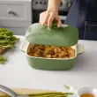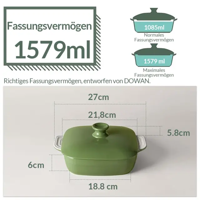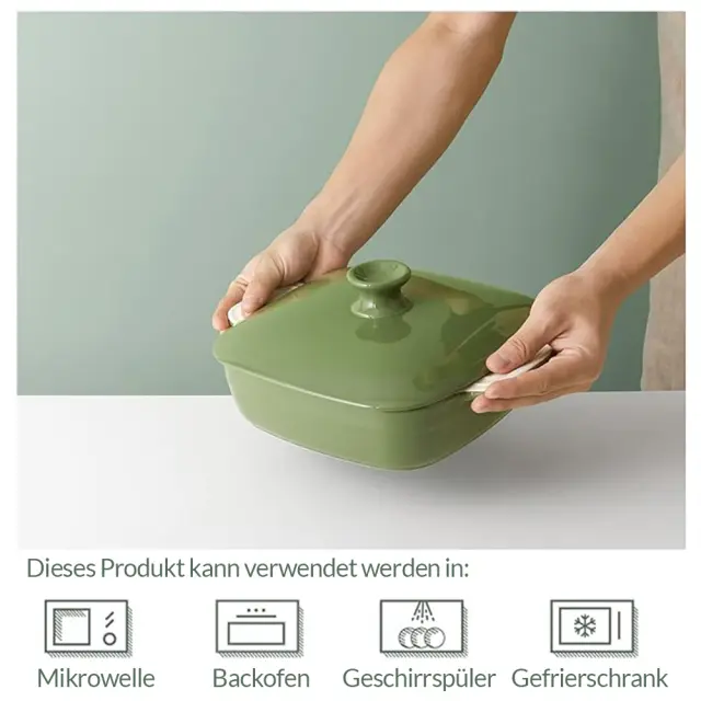 Globok pekač: zunanji premer 21,8 cm, notranji premer 18,8 cm, globina 6 cm, 1579 ml. Velik pekač je idealen za lazanjo, torte, piščanca, pečenke in enolončnice. Lazanja je popolne velikosti in jo lahko razdelite na 2 plasti/4 porcije, da zadovoljite 2 ali 3 osebe. Nedrseč ročaj in pokrov: Pravokotna pekača ima dvojni ročaj z reliefnim dizajnom, ki omogoča trden oprijem in olajša odstranjevanje iz pečice. Zasnova pokrova spodbuja ohranjanje hrane in preprečuje odpadanje prahu in drugih snovi. Živilski porcelan: Pekač je izdelan iz trpežnega porcelana, je odporen na vročino in ima hitro toplotno prevodnost. Lahko blokira absorpcijo vlage in prepreči razpoke in gubanje. Keramična posoda za torto je primerna za pomivanje v pomivalnem stroju, mikrovalovno pečico in pečico do 260 °C. Reliefno dno in enostavno čiščenje: Svetlo zelena glazura naredi površino bolj gladko in ščiti globoko posodo za torto pred madeži. Lahko jih preprosto operete z milom ali vročo vodo. Dno ima reliefno obliko, ki zagotavlja videz in preprečuje prijemanje na model. Klasični pekač: Ta minimalistični zeleni pekač ne bo nikoli šel iz mode. Odlično darilo zase. S pekačem lahko v prostem času pripravite enolončnice in pečenega piščanca. Prav tako idealno darilo za prijatelje ali družino, ki radi pečejo.
