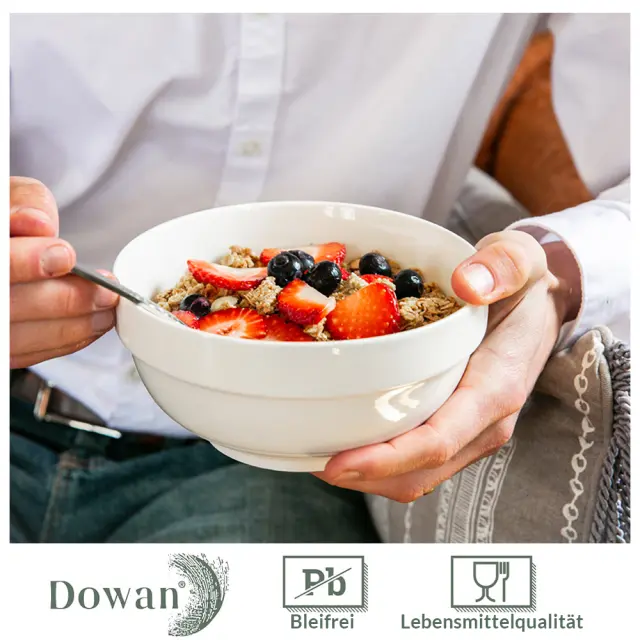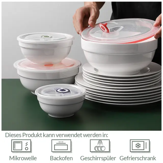 Vsestranski komplet skled 1893/1242/651/355 ml: Keramična skleda s prostornino 1863/1242 ml se lahko uporablja kot servirna skleda za pripravo solate, rezancev, juhe in kot majhna mešalna skleda za torte, piškote in pripravo receptov. 651/355 ml za kosmiče, juho, sladoled in sladico. Pokrov ohranja hrano svežo: Priprava in serviranje s temi posodami za shranjevanje hrane nista problem. Zahvaljujoč pokrovu se lahko keramične sklede uporabljajo tudi za shranjevanje ostankov hrane ali pripravkov hrane. Sklede s pokrovi ohranjajo hrano svežo in toplo. Primerno za mikrovalovno pečico in pomivanje v pomivalnem stroju: Za razliko od steklenih skled so te sklede za solato izdelane iz visokokakovostne keramike brez svinca in odporne na lomljenje. So trpežne za ponovno pogrevanje in varne za mikrovalovno pečico, pomivalni stroj, pečico in zamrzovalnik. Prihranijo prostor in so odporne na praske: Te keramične servirne sklede lahko zlagate na drugo, da prihranite prostor v omari. Gladek porcelan naredi te servirne sklede odporne na praske, ko jih uporabljate z žlico ali vilicami. Lestvica z datumom za označevanje časa shranjevanja: Majhne številčnice na vrhu pokrovov vam lahko pomagajo označiti datum začetka shranjevanja, tako da lahko spremljate čas shranjevanja. S pokrovom lahko enostavno shranite ostanke hrane. Premaknite se neposredno z mize v hladilnik, namesto da umažete še eno posodo.