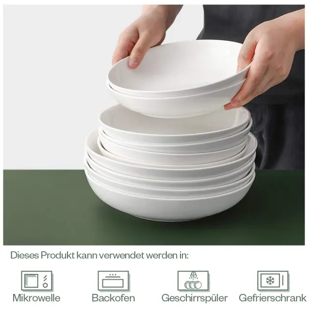 Profesionalni porcelan: Naše sklede za testenine so izdelane iz visokokakovostnega novega porcelana, zato so zasnovane za vzdržljivost in odpornost proti praskam. Prav tako lahko prenesejo visoke temperature v pečicah in mikrovalovnih pečicah, zaradi česar je pogrevanje hrane priročno. Velike vsestranske sklede: Z dimenzijami približno 21,6 cm x 4 cm in prostornino približno 946 ml so naše sklede idealne za testenine, solate za večerjo, juhe, kosmiče, zrezke in jedi z omako. Prav tako se odlično obnesejo kot servirne sklede za pripravo hrane. Odlične za vsakodnevno uporabo: Ročno izdelana zasnova sklede omogoča enostavno držanje in uporabo, idealna je za posamezne porcije, večerje v parih ali družine ter zabave z več ljudmi. Enostavno čiščenje: Bela skleda ima gladko teksturo, zaradi česar je čiščenje izjemno enostavno, ne glede na to, ali jo raje perete ročno ali v pomivalnem stroju. Zlagate jih lahko v komplete po 6, kar omogoča enostavno shranjevanje in prihranek dragocenega prostora. Elegantna predstavitev: Klasične bele sklede so popolne za vsako priložnost. Brezhibna bela barva poudari prave barve vaše hrane in se brezhibno podpre z vsako mizo. So elegantno darilo za vselitev, poroko ali zabavo.