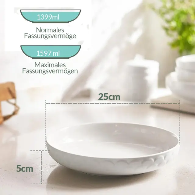 Vsestranske sklede za vsakodnevno uporabo: Te sklede za rezance imajo globino 5 cm in premer 25 cm, so dovolj široke in plitke, da lahko služijo kot skleda za rezance, skleda za juho, skleda za solato, odlične pa so tudi kot servirna skleda ali krožnik za priloge. Velika prostornina: S prostornino 1597 ml ta skleda za solato in rezance sprejme veliko porcijo hrane. Primerni so za serviranje testenin, solat, juh, rezancev, kosmičev za zajtrk, ocvrtih jedi, morskih sadežev in še veliko več. Ploska in široka oblika: Ti beli krožniki za večerjo so široki in ploščati ter jih je mogoče popolnoma zložiti drug na drugega. V njej lahko postrežete karkoli z malo tekočine, ne da bi se polilo. Nova skleda za rezance iz kostnega porcelana: Izdelana je iz zelo trdega keramičnega materiala, zato je zelo odporna na praske in poškodbe zaradi jedilnega pribora ali drugih trdih predmetov. Površina je obdelana s posebnim postopkom, ki preprečuje madeže in razbarvanje zaradi ostankov hrane ali umazanije. Zaradi lahke zasnove je skleda enostavna za rokovanje in uporabo, idealna za gospodinjstva. Primerno za mikrovalovno pečico, pomivalni stroj, pečico in zamrzovalnik: Te sklede za rezance so izdelane iz visoko žganega porcelana in gladke glazure, zato so brez vonja in okusa. Ker ne vsebujejo svinca, so močne in vzdržljive za dolgotrajno vsakodnevno uporabo. Posebna valovita dekoracija: So preproste, navadne bele barve in primerne za vsako večerjo. Zaradi edinstvenega valovitega dizajna so dovolj sproščeni za vsakodnevno uporabo, a hkrati tudi dovolj presenetljivi, da navdušijo vsakega gosta, pa naj bo to zahvalni dan, božič, obletnica in tako naprej.