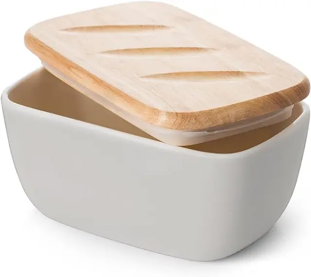 • Izboljšan leseni pokrov - Maslena skleda s pokrovom pomaga ohranjati vaše **maslo sveže v hladilniku**, brez mešanja drugih okusov hrane. Silikonski tesnilni obroč lahko preprosto odstranite za **boljše čiščenje ali ga zamenjate**.