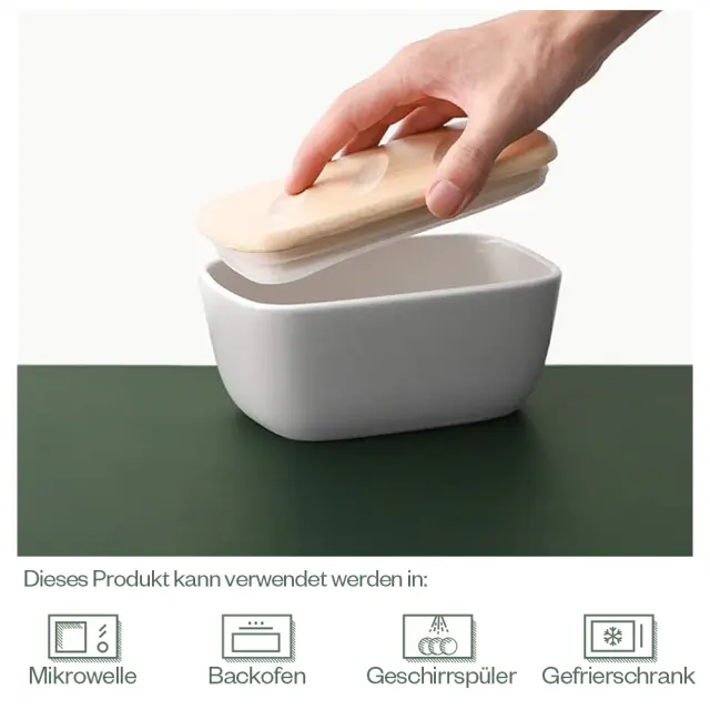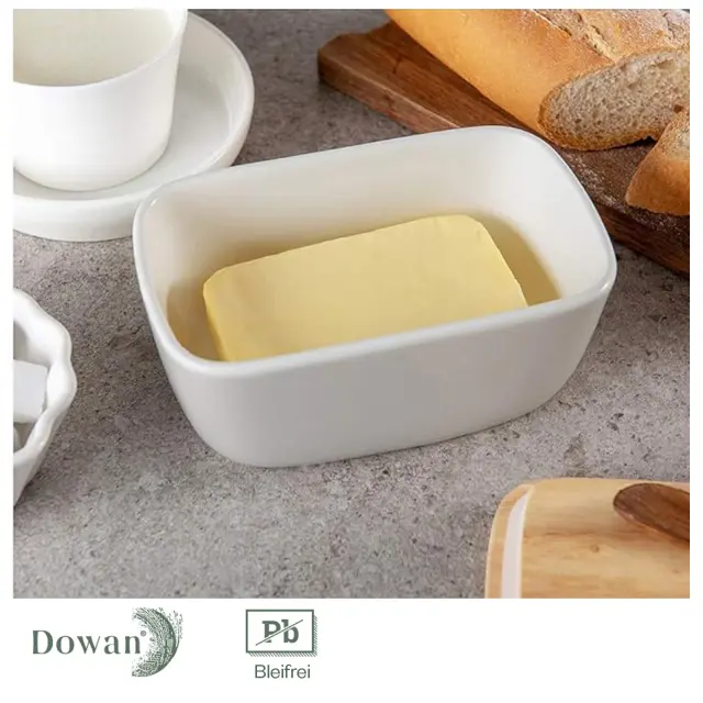 • Zdrav porcelan - Za razliko od plastike keramične maslene sklede ne vsebujejo škodljivih plastik, kadmija ali svinca. Brez kemikalij se vam ni treba bati prodiranja **BPA ali drugih škodljivih snovi** v telo. Je varna tako za vašo družino kot tudi za okolje.