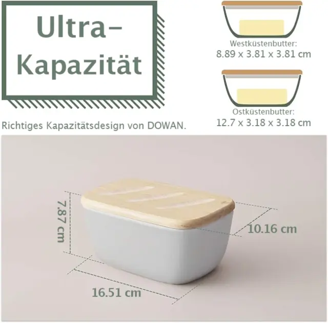• Globoka in široka zasnova - Naša velika maslena skleda meri 16,5 x 10,2 x 7,9 cm, kar je dovolj široko in globoko, da sprejme široko paleto palčk masla. Maslena skleda s pokrovom deluje odlično za 2 palčki masla iz vzhodne obale ali 1 kocko masla iz zahodne/evropske obale.