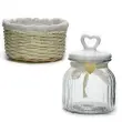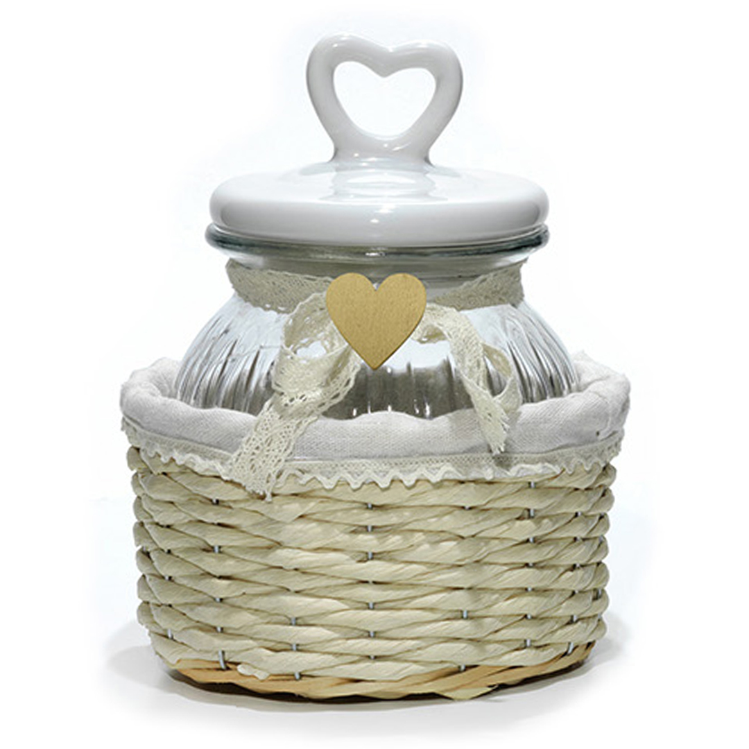 Bel keramični pokrov z ročajem v obliki srca, omogoča hermetično zapiranje posode, pletena košara pa poskrbi za dodaten okras. Primerno za pomivanje v pomivalnem stroju (samo kozarec in pokrov). Velikost steklene doze: premer 16,5 cm, h21cm. Višine s košaro je 25 cm.