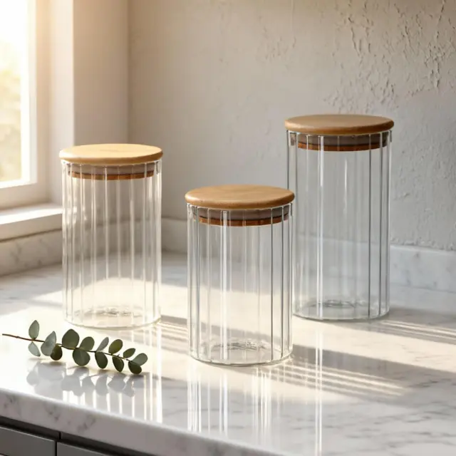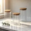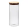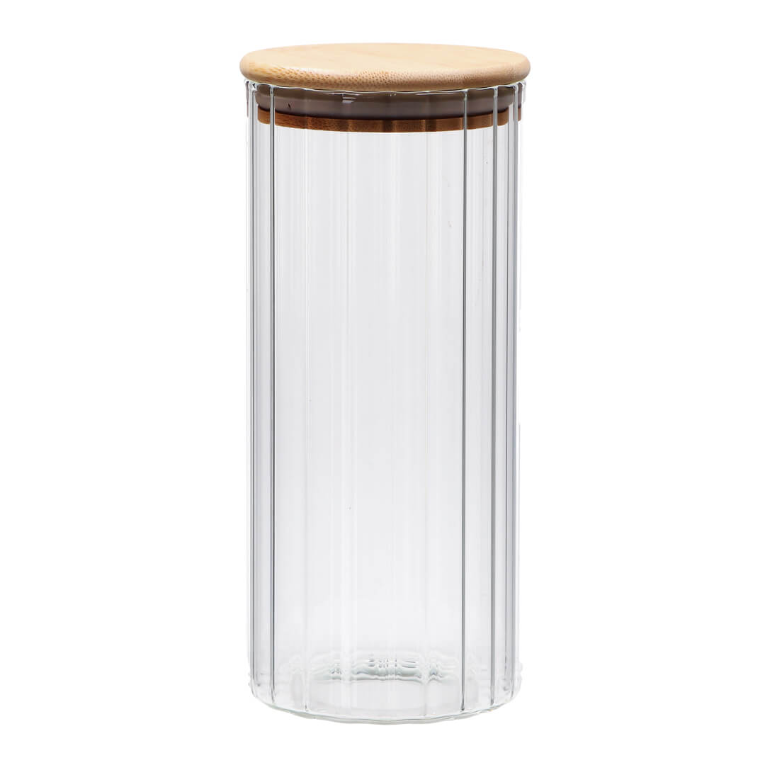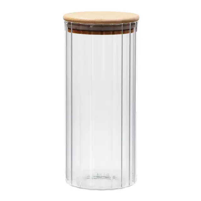 Eleganten in praktičen steklen kozarec (doza) za shranjevanje je odlična rešitev za organizacijo kuhinje. Izdelan je iz kakovostnega stekla z rebrastim reliefom, ki mu daje prefinjen videz in omogoča enostaven pregled nad vsebino. Posoda ima pokrov iz bambusovega lesa, ki je opremljen s silikonskim tesnilom za nepredušno zapiranje, kar ohranja svežino shranjenih sestavin. Posoda je idealna je za shranjevanje kave, čaja, testenin, oreščkov ali drugih suhih živil. Steklen kozarec je primeren za pomivanje v pomivalnem stroju.