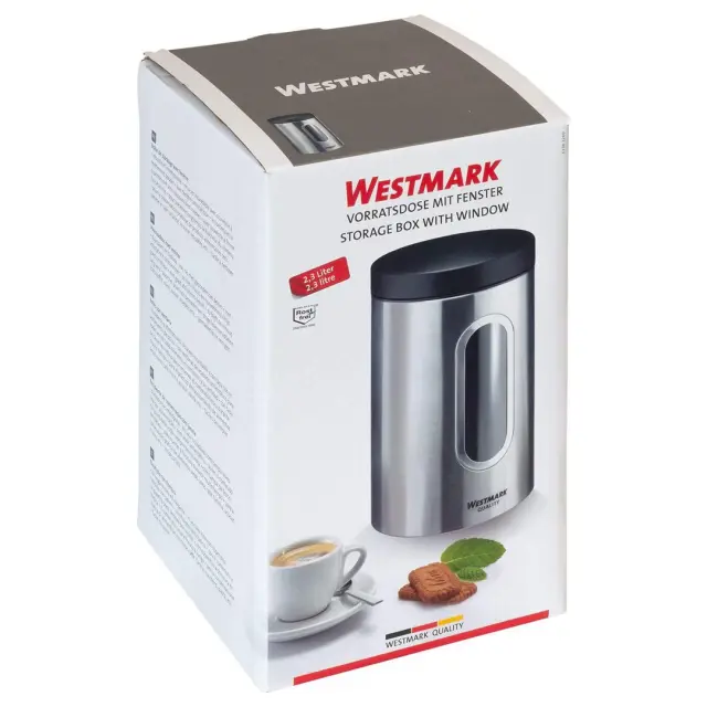 WESTMARK DOZA Z OKNOM s prostornino 2300 ml je idealna za shranjevanje suhih živil kot so kava, moka, sladkor, testenine, riž itd. Brezčasna okrogla posoda za shranjevanje je izdelana iz nerjavečega jekla, praktičen pokrov dobro tesni ter se enostavno odpira in zapira, praktično antistatično okno pa omogoča vpogled v posodo.