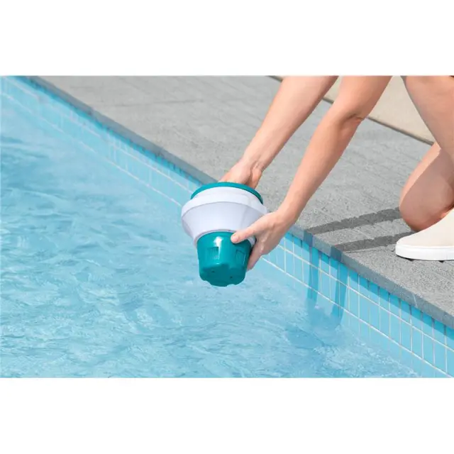 Dozirni plovec omogoča enakomerno porazdelitev bromovih in klorovih tablet s premerom do 7,6 cm (tablete niso priložene).