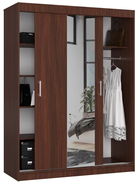 150 cm široka CLP drsna omara z ogledalom v barvi wenge je zelo zanimiv in kar je najpomembneje, praktičen kos pohištva, ki nudi dovolj prostora za organizirano shranjevanje različnih predmetov; zaradi svojega klasičnega in elegantnega videza se bo odlično prilegala mnogim notranjostim, ne glede na njihov značaj, zato lahko predstavljeni model omare uspešno uporabimo kot element pohištva v spalnici, garderobi, hodniku ali celo dnevni sobi, vse resnično temelji na naših individualnih preferencah. Velika wenge omara ponuja vrsto prednosti, ki izhajajo iz njene uporabe, saj ima številne zelo uporabne rešitve za vsakodnevno uporabo, ki se ne nanašajo le na ogledalo, ki nam omogoča, da preverimo, ali naš izbrani stil ustreza, temveč vključujejo tudi palico za obešanje oblačil in veliko število polic; druge prednosti predstavljenega izdelka vključujejo: drsni sistem, ki temelji na aluminijastih profilih, kar omogoča udobno premikanje vrat, kar omogoča dolgo in brezskrbno uporabo, visokokakovostne materiale in komponente, uporabljene v proizvodnem procesu, kot je laminirana plošča, ki zagotavlja odlično trajnost in trdnost pohištva, ter zaščito robov z uporabo ABS furnirja, kar prav tako prispeva k estetskemu videzu celote; 150 cm široka drsna omara z ogledalom je odlična izbira za vse, ki cenijo tako visoko kakovost v takšnih izdelkih kot tudi njihovo privlačno ceno, enostavno sestavljanje in prej omenjeno ergonomijo vsakodnevne uporabe.