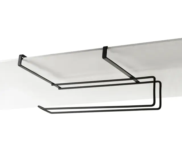 Praktično in elegantno držalo za papirnate brisače MODERN KITCHEN je idealna rešitev za moderno kuhinjo. Izdelano je iz trpežnega kovinskega materiala z mat črno površino, ki doda estetski pridih in se harmonično vklopi v sodobne ali industrijske notranje opreme. Ergonomska oblika omogoča enostavno namestitev na vrata kuhinjske omarice brez potrebe po vrtanju ali trajnem montažnem posegu, s čimer ohranja čist videz kuhinje in prihrani delovno površino.
