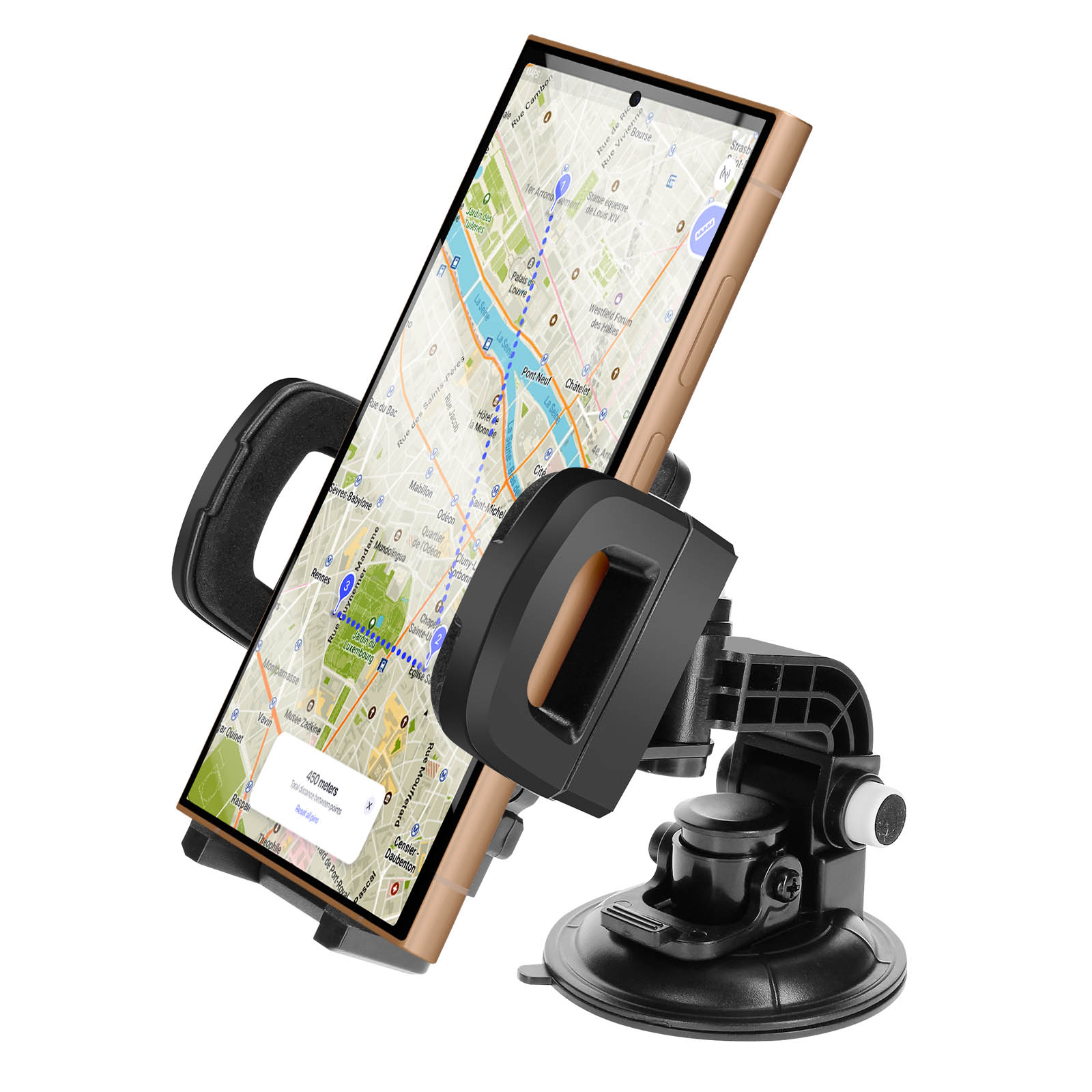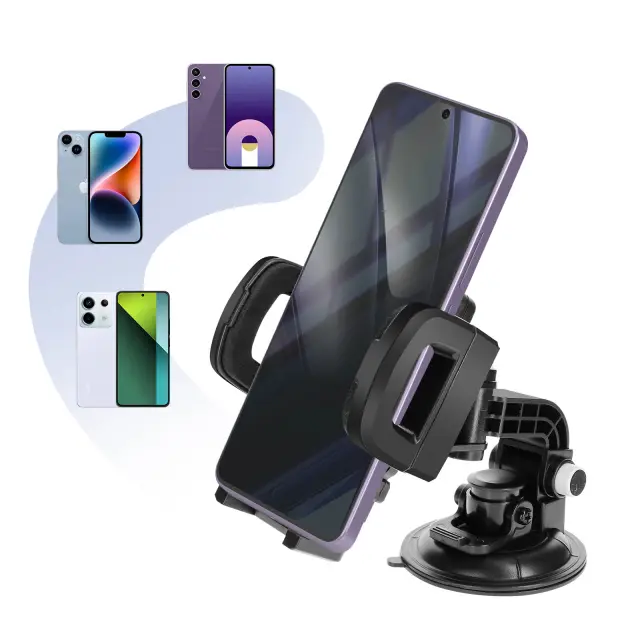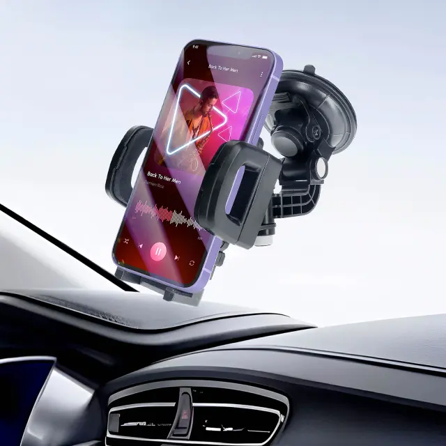 Nosilec za avto z močnim priseskom za trden oprijem na vetrobranskem steklu ali armaturni plošči. Kroglični sklep in vrtljiva glava za popoln kot gledanja. Trdna roka za večjo stabilnost tudi na najbolj razgibanih cestah. Univerzalna združljivost z nastavljivimi sponkami za večino pametnih telefonov.