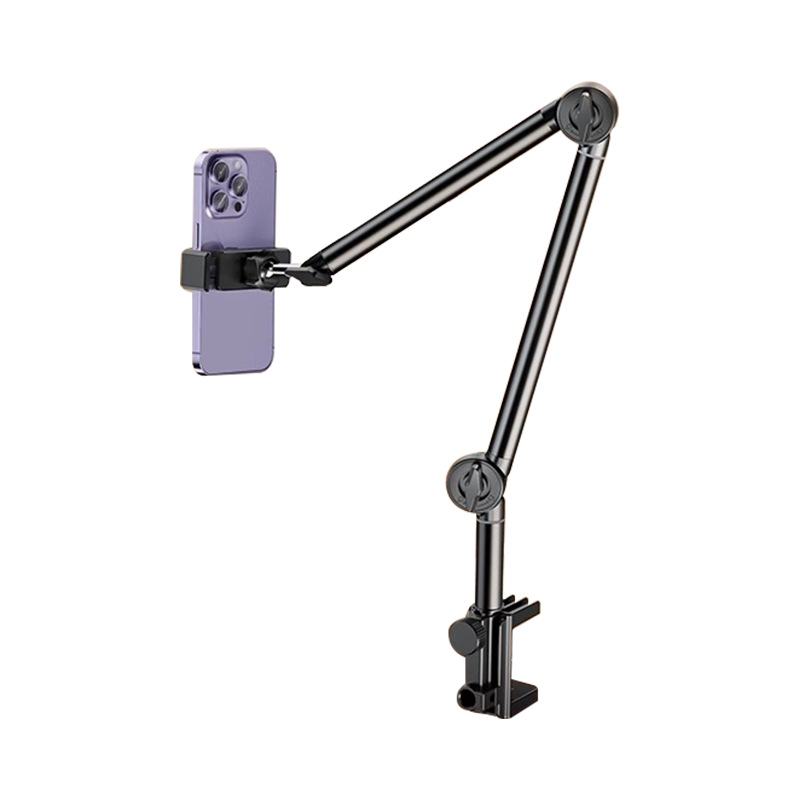 Stabilno in nastavljivo: Izdelano iz robustnega karbonskega jekla, to stojalo zagotavlja neomajno oporo za vaš telefon. Njegova zasnova z dvema rokama omogoča prilagodljivo pozicioniranje, tako da lahko najdete popoln kot gledanja, ne glede na to, ali pretakate, opravljate video klice ali brskate.