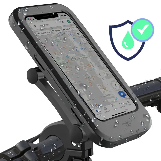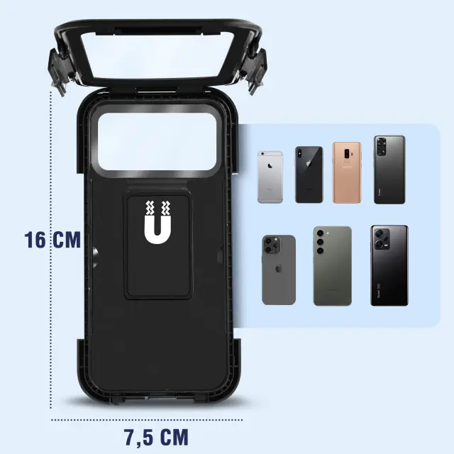 Odkrijte to držalo za telefon, pripravljeno, da vas spremlja na vseh vaših potovanjih. Popolnoma vodoodporna opora, ki ohranja vaš telefon zaščiten v deževnem vremenu. Razširjena združljivost za krmila koles, krmila skuterjev in krmila motornih koles. Združljiv z vsemi telefoni do višine 16 cm in širine 7,5 cm.
