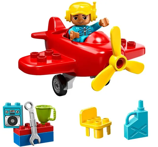 Z LEGO® DUPLO® Mesto lahko odigraš resnične prizore iz vsakdanjega življenja: to je prepoznaven svet s sodobnimi DUPLO figurami. Otroku pokažite, kako naj v delavnici pomaga pilotu s ključem in posodico z oljem za mazanje popraviti letalo. Malčki bodo uživali pri sestavljanju ljubkega rdečega letala, z njim bodo vzletali in letali po zraku ter med divjimi sodčki vrteli propeler! V kompletu z učno igračo je DUPLO figura pilota.