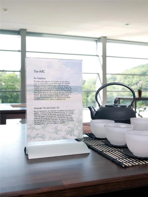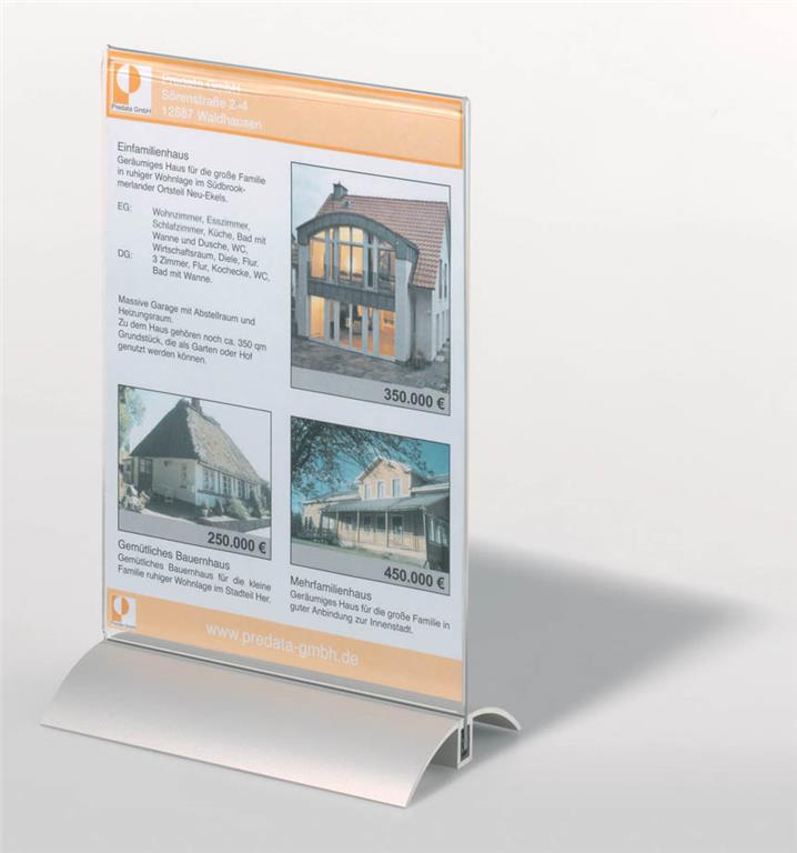 - elegantno namizno stojalo iz prosojnega akrila na visokokakovostnem aluminijastem podstavku - primerno za prikazovanje informacij, menijev, letakov - dimenzije 150 x 237 x 85 mm