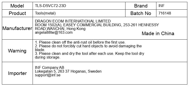 1. Pred prvo uporabo očistite olje proti rjavenju. 2. Ne režite trdih predmetov na silo, da preprečite poškodbe rezila. 3. Po vsaki uporabi očistite in posušite orodje. Med shranjevanjem naj bo orodje suho.