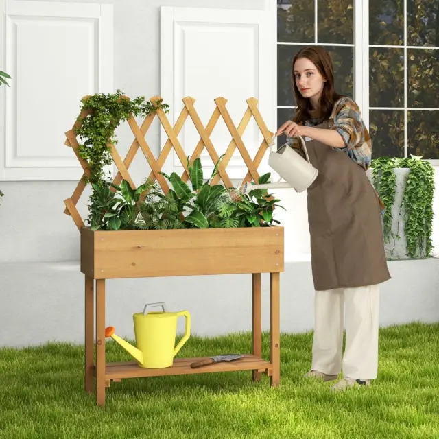 Izbran material iz naravnega jelkinega lesa: Dvignjena greda je izdelana iz 100 % naravnega jelkinega lesa, ki se ne deformira zlahka ter zagotavlja trpežnost in dolgo življenjsko dobo. Ima tudi vodoodporno lakirano leseno površino, ki zagotavlja dolgotrajno uporabo na prostem.